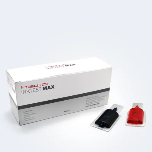 The InkTest MAX is a new generation of ink tests for the routine testing of sealing seams as per ISO 11607-1 and ASTM F1929-23. The InkTest MAX (blue) is suitable for film and paper packaging, and InkTest MAX PLUS (red) is suitable for Tyvek®, PP fleece, PP non-woven and other polyolefin materials.